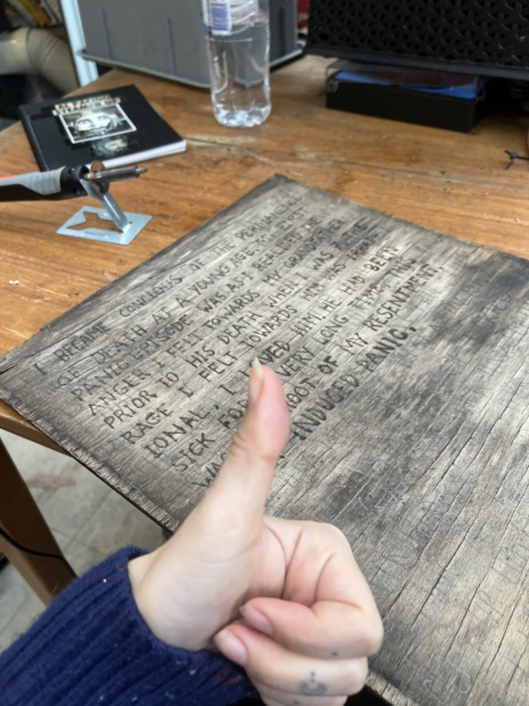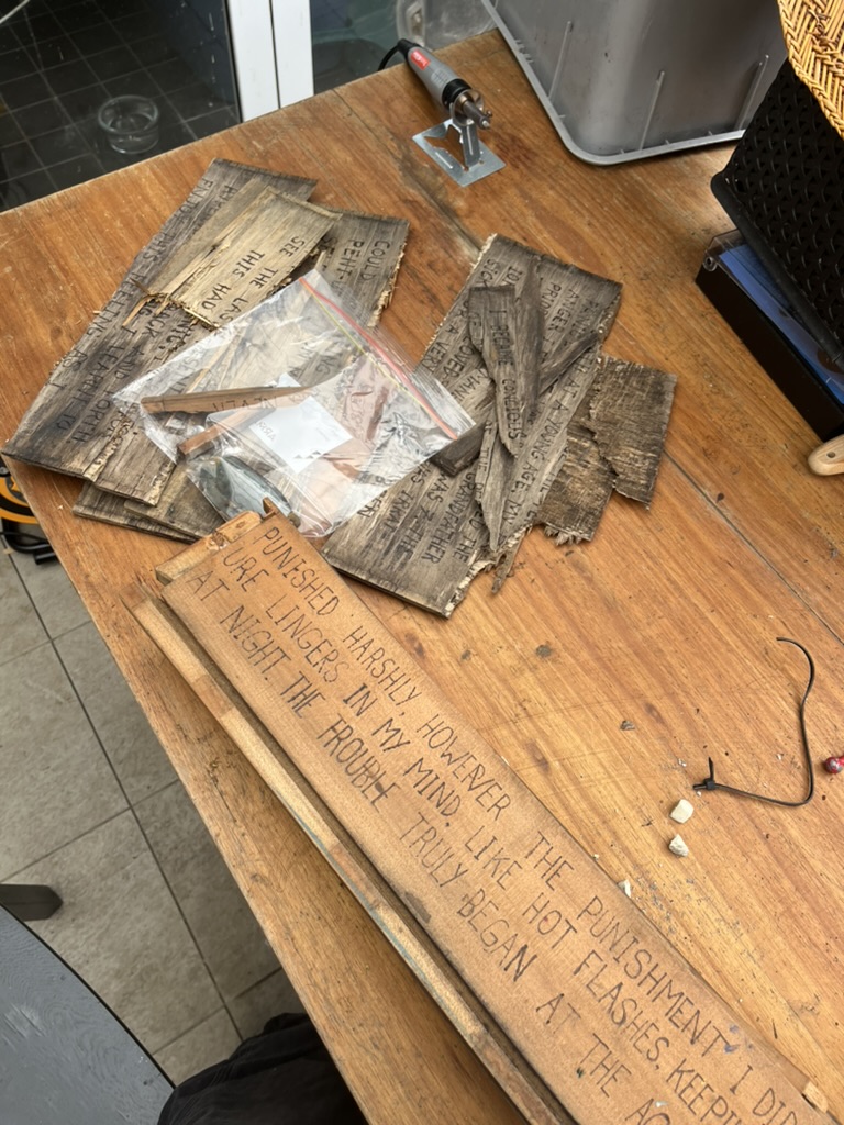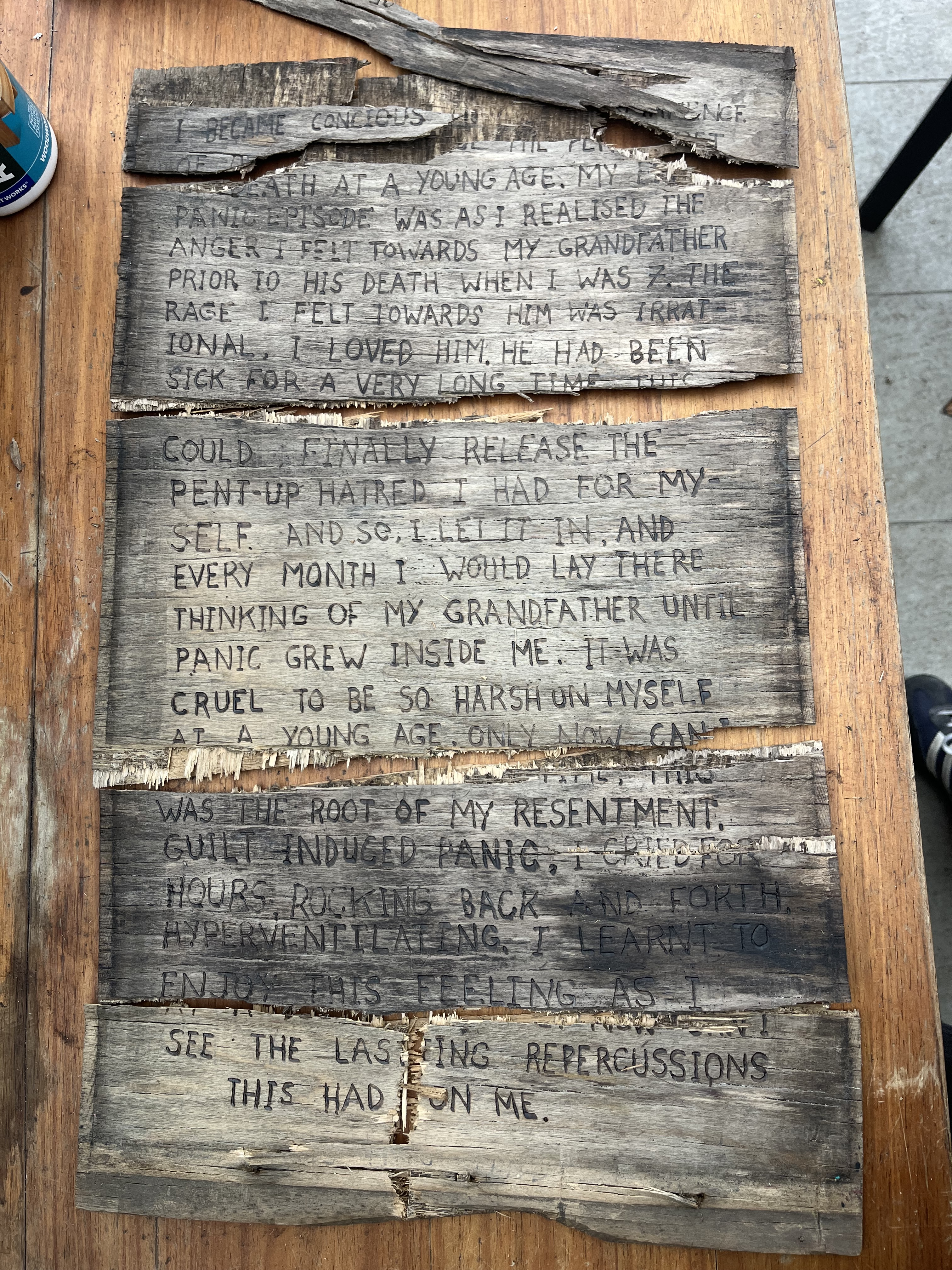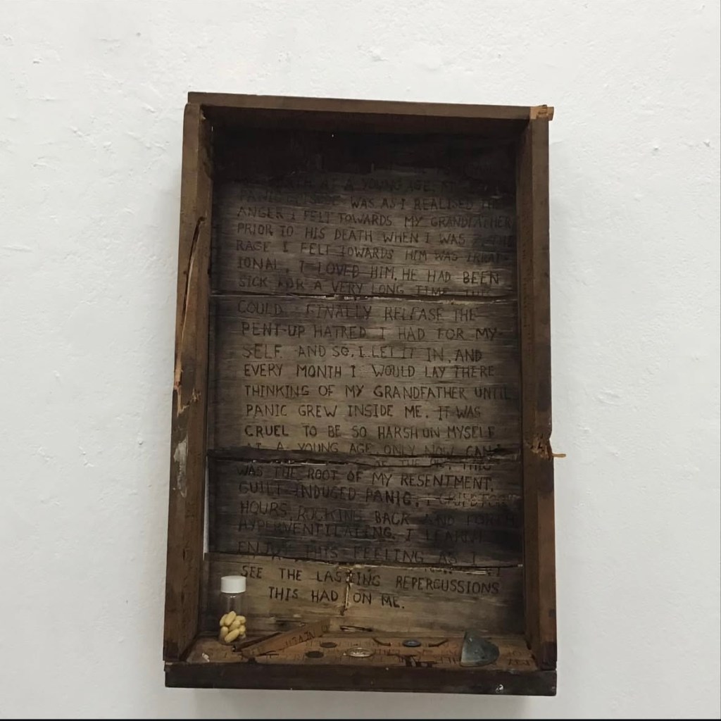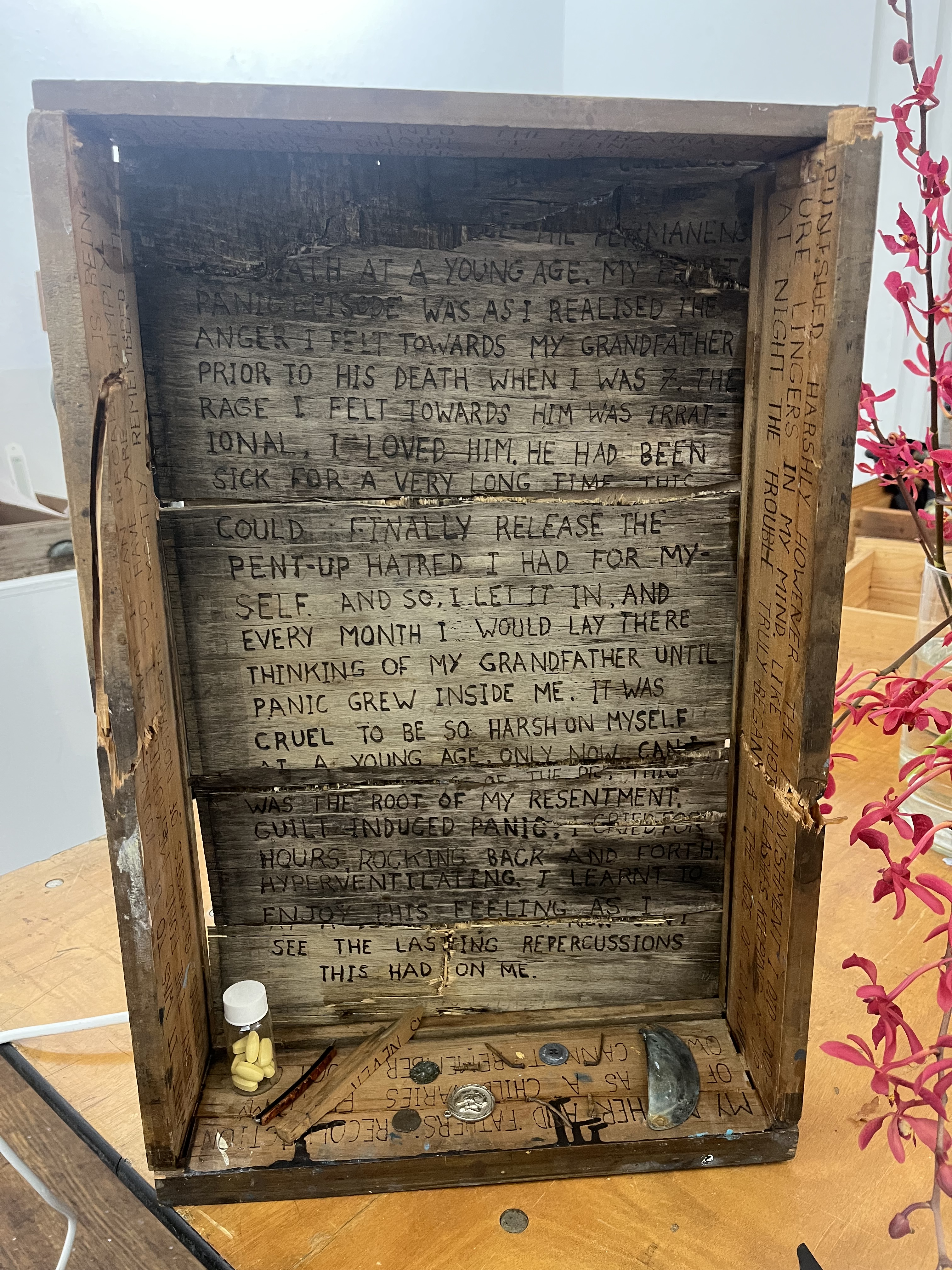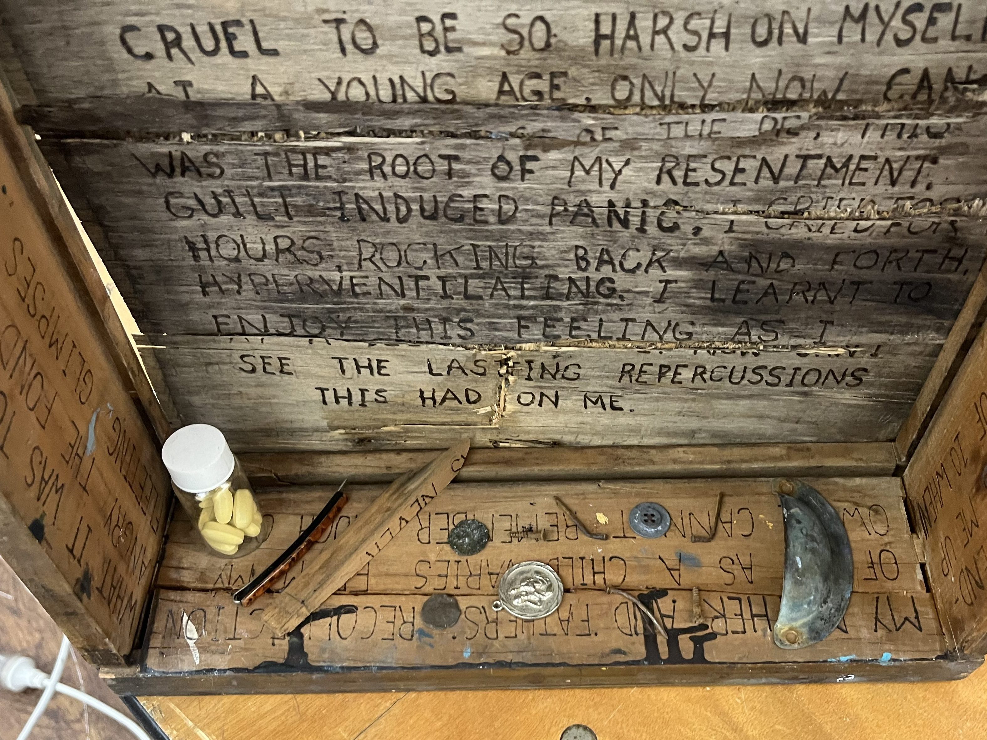 My discarded drawer is a personal assemblage, which has been methodically deconstructed, inscribed with a textual piece examining memory, trauma, and unresolved childhood grief, and then reassembled incorrectly, disrupting its original function and form. This deliberate misalignment mirrors the fragmented and unreliable nature of memory—particularly those formed in childhood amidst emotional turmoil.