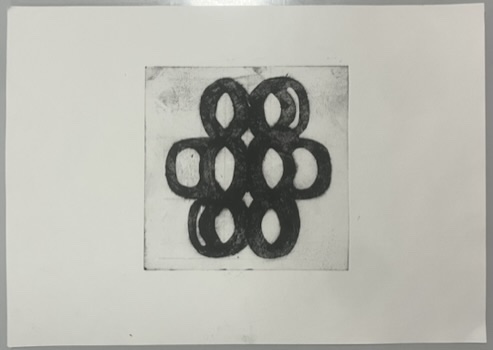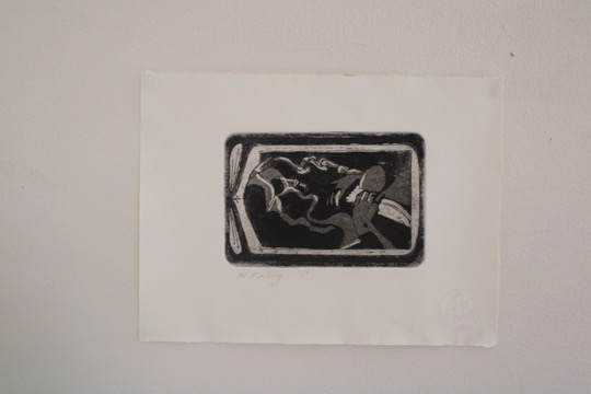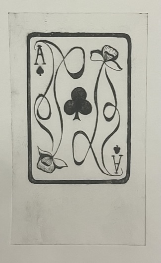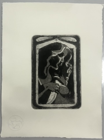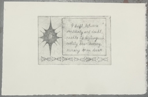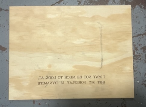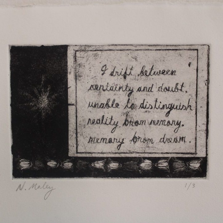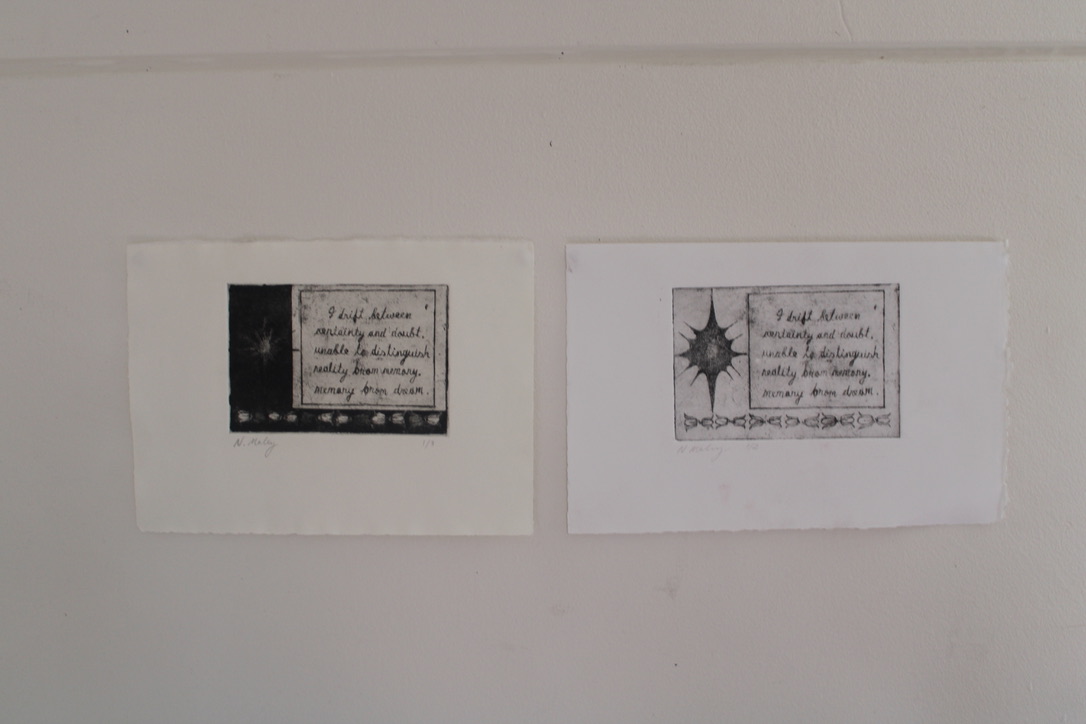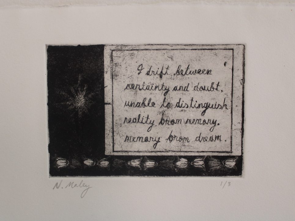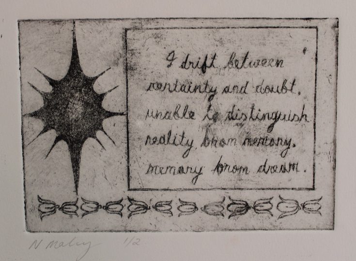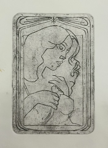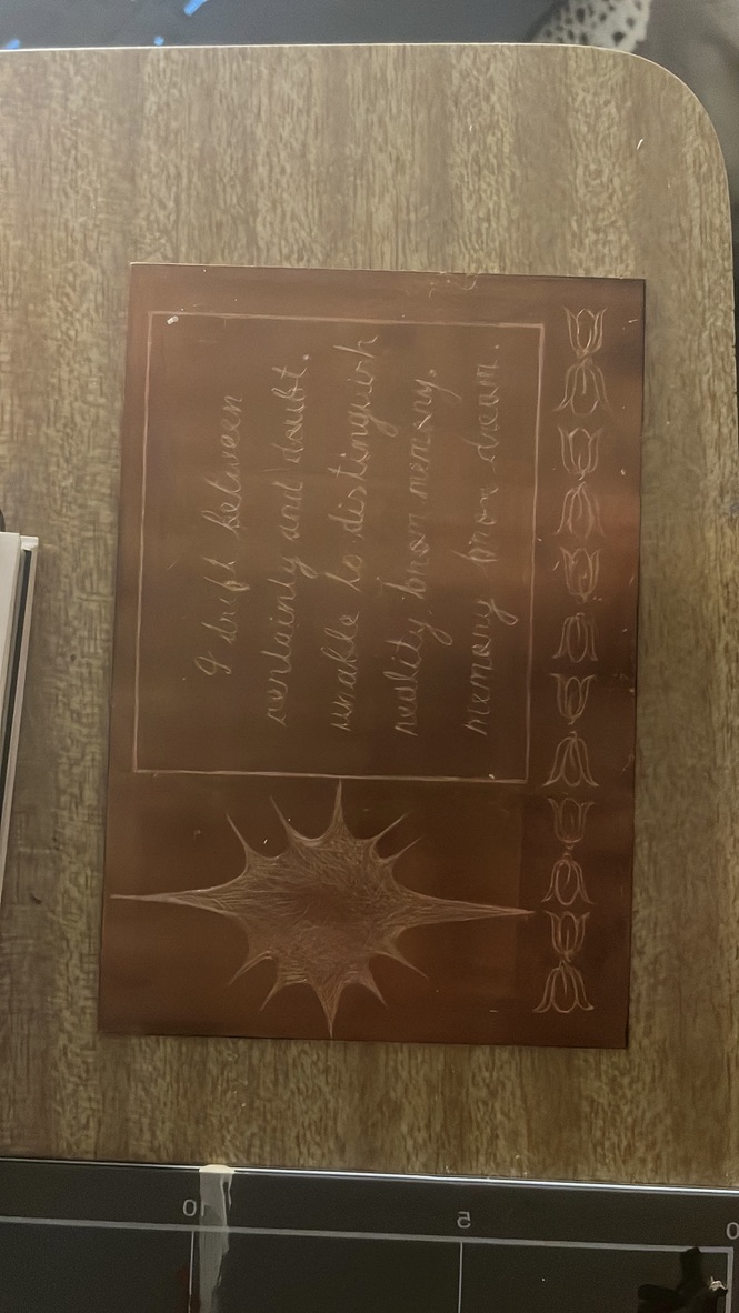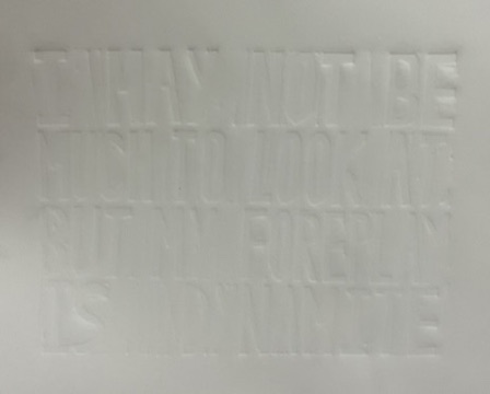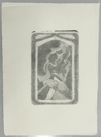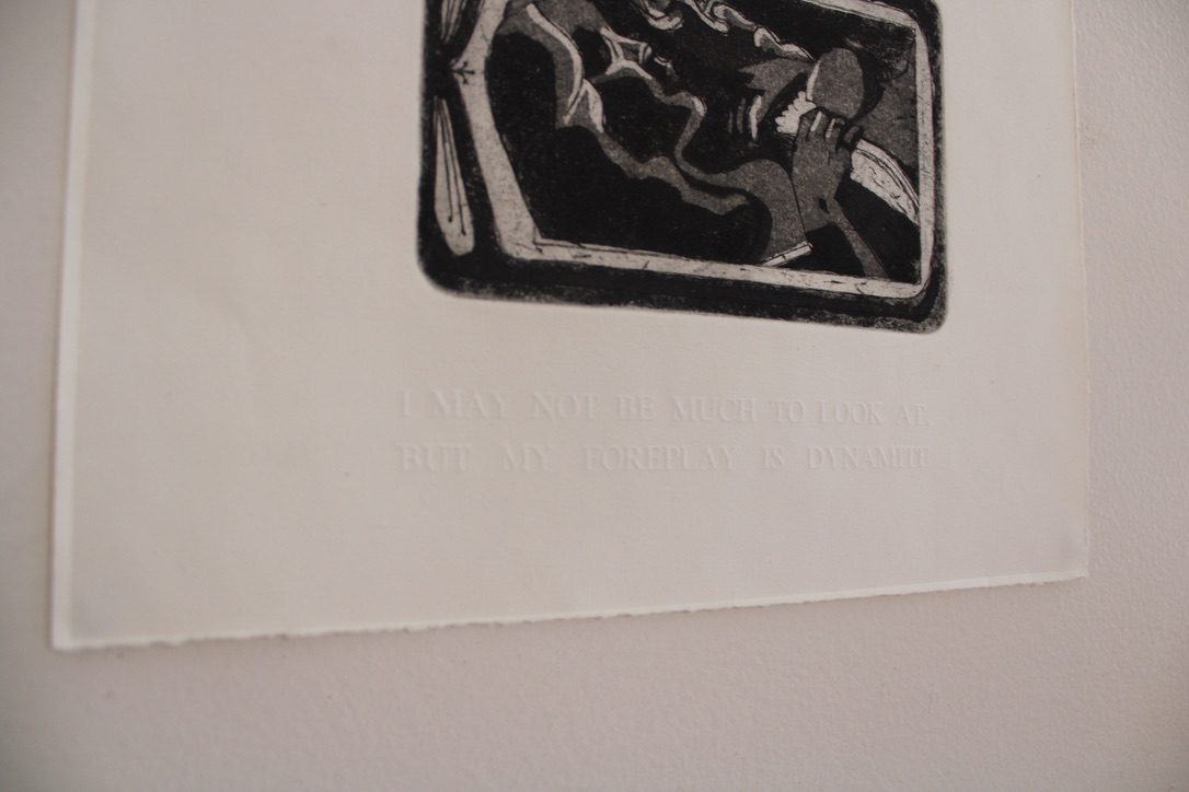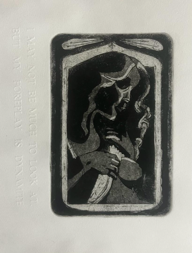 My final piece explores distaste within the traditional porn industry. I sourced an image taken from an old Penthouse Australia magazine and reimagined it in an Art Nouveau-esque way. Within the Art Nouveau scene, the female figure is often depicted in a sensual manner, not oversexualized or graphic. They have an essence of appreciation rather than commercialisation of the female figure like porn. My exploration of wordplay begun with listing all the words and phrases I found disturbing within the same magazine. I experimented with blind embossing to create a conceptual relation to the image. The text reads “I MAY NOT BE MUCH TO LOOK AT, BUT MY FOREPLAY IS DYNAMITE”, an absurd comment to have situated beneath a photograph of a model, chosen for her beauty. This of course was not written by her, and so I used a times roman font, to represent traditional typewriter text to highlight its frivolous impersonal nature. The technique of blind embossing aimed to explore the dynamic of an absurd oversexualized comment written by a man (presumably) in an office playing off that it was written by this woman. It also simply represents the nature of the traditional porn industry simply targeted towards cis gendered heterosexual men. There was a lot of trial and error involved in the blind embossing, I tried dry point, Lino and then concluded on laser cut plywood, which left the cleanest and most eligible mark. I used both hardground etched and aquatint techniques on my copper plate to create depth and shadow. The dark aquatint on the face of the model represents the shadow and facelessness of the porn industry.