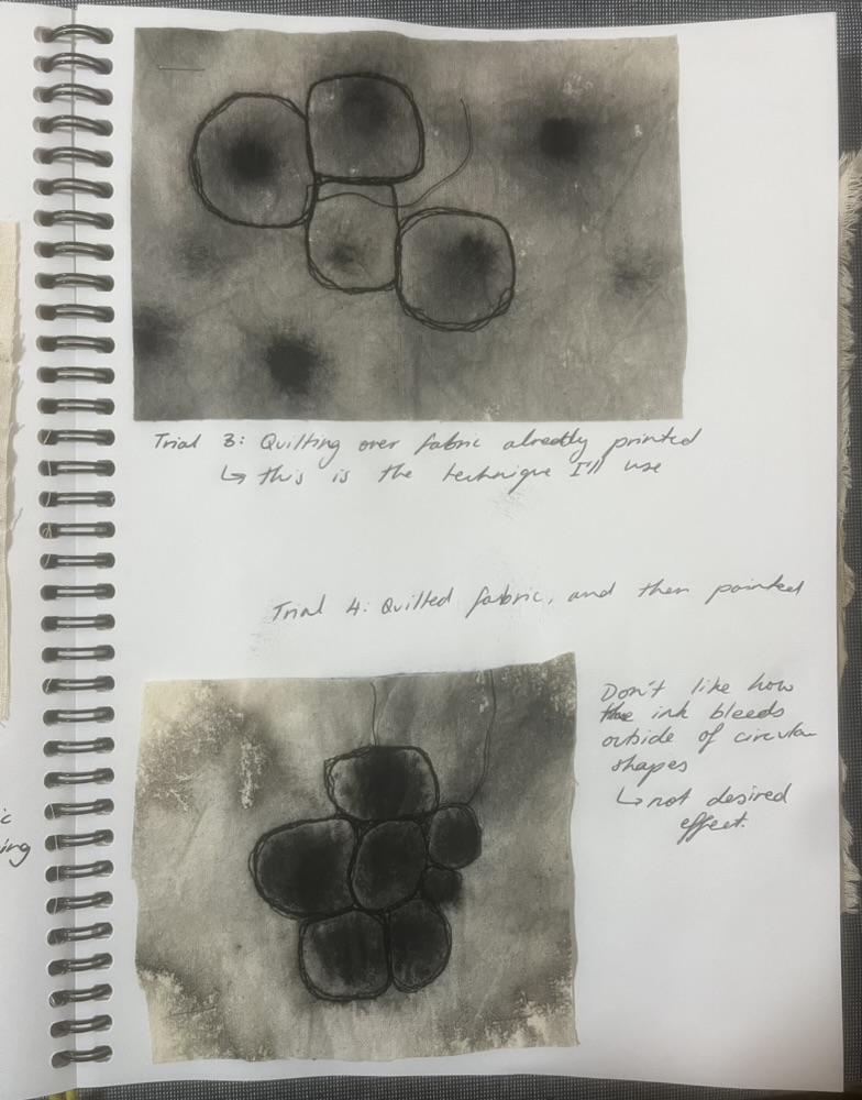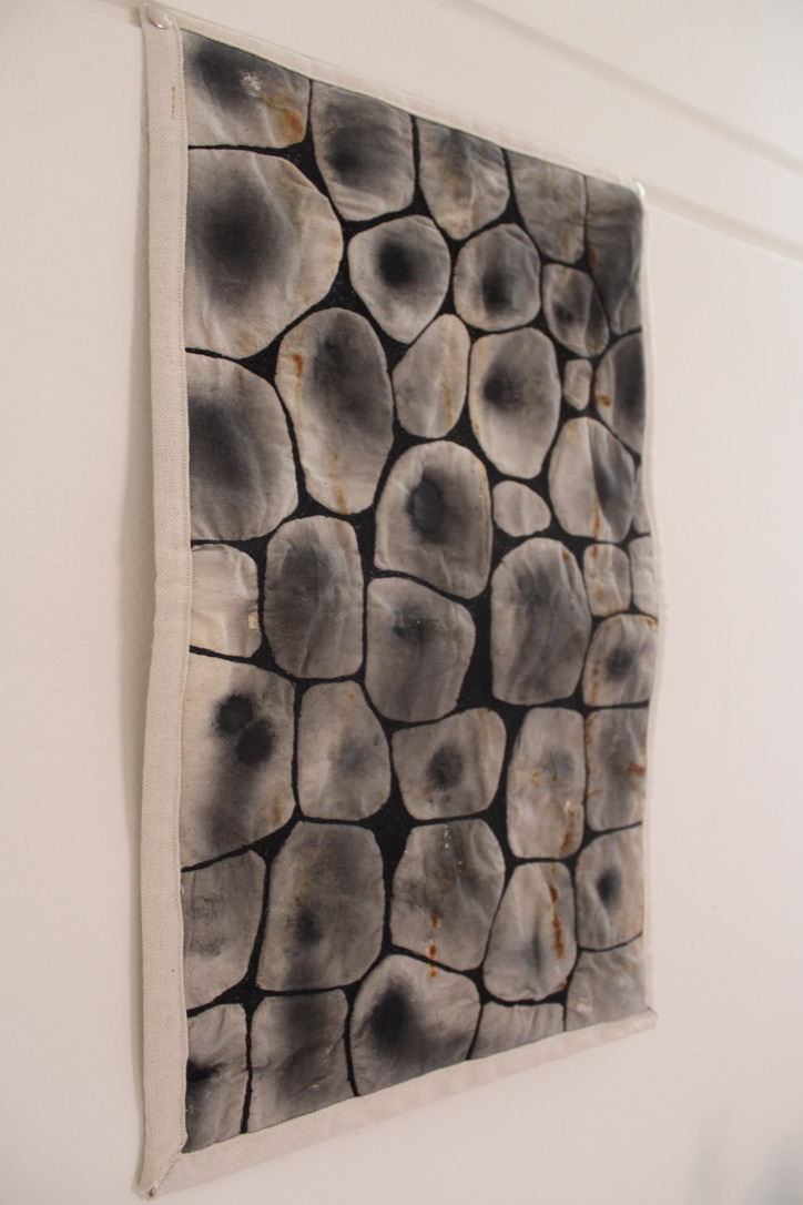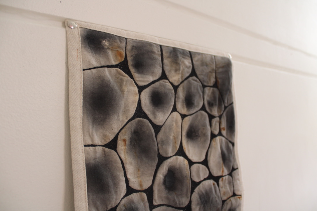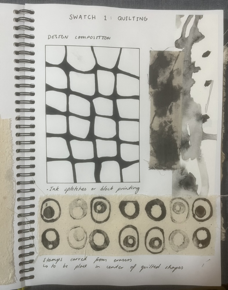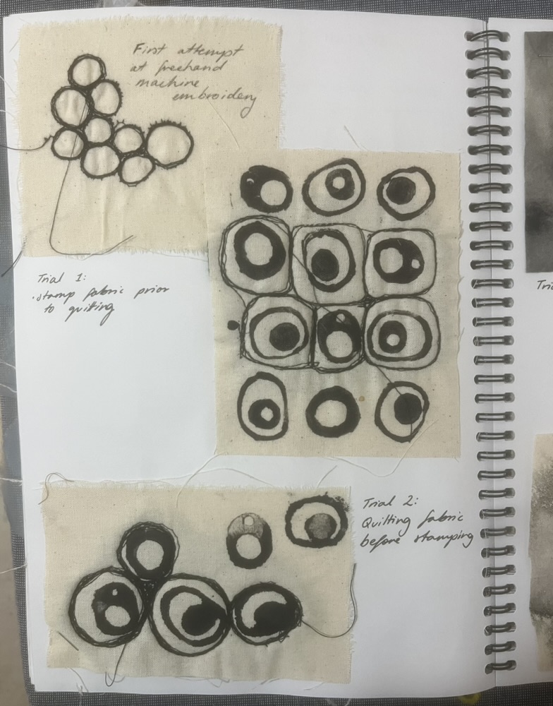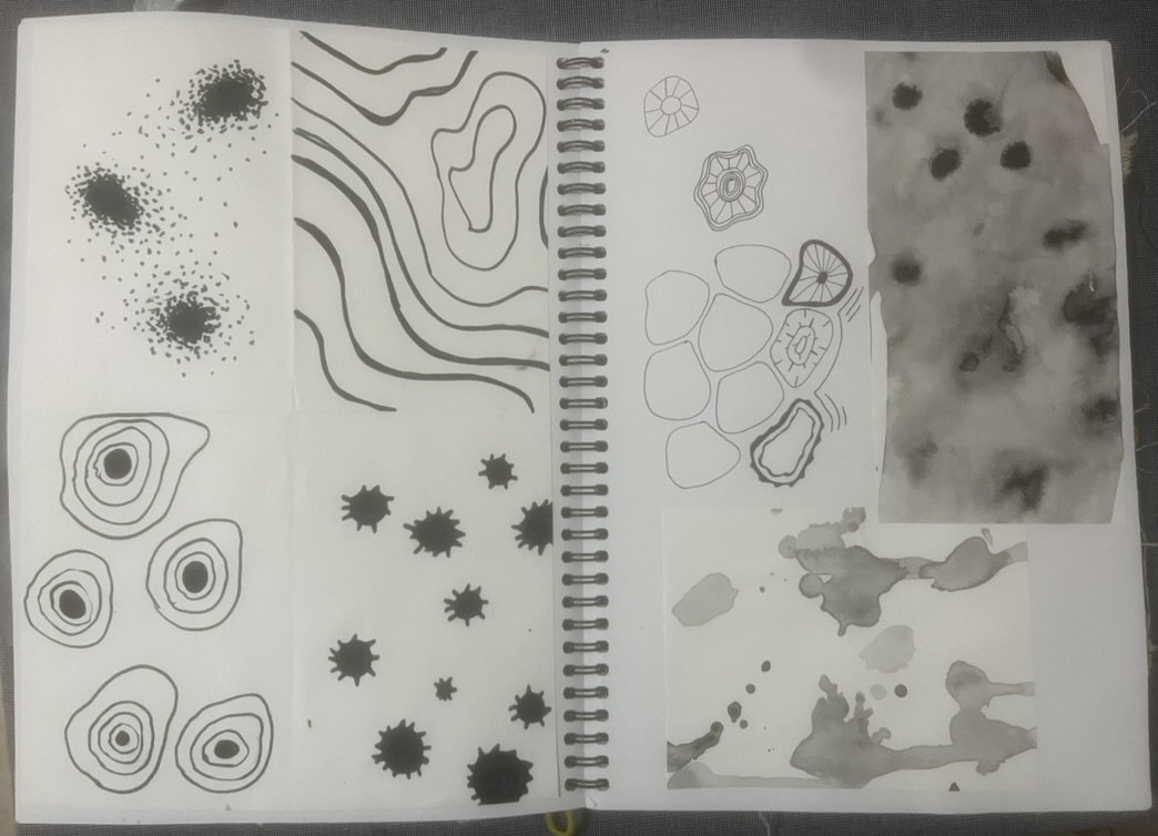 Design Statement: A new life form is born in all its beauty and disgust. The notion of renewal can be identified within the theme of mould through the regeneration of organisms on dying organic matter within soil, and the growth of mould upon natural fibres under specific conditions. Textiles made from natural fibres are hygroscopic, under the right conditions mould thrives upon these fibres, and is a resilient life form therefore difficult to rid of once infection spreads. On the contrary, mould is an important form of renewal as it is essential in the breakdown of organic plant matter within soil. As mould decomposes organic matter beneath the soil, it consumes nutrients which are returned to the soil creating rich compost, and therefore the renewal of organic matter. To explore this, only natural fibres, materials and dyes were used in the process of creating the swatches. The texture and colours of varying types of mould have individually influenced the design process of each swatch created. This piece explores the design practice of textile production, focusing on shapes and how they can be used to create depth and suggest the imagery of mould. The calico base was saturated in water before being painted with black ink to create a moulded design effect. The swatch was then quilted using freehand machine embroidery and felt backing to create texture. This piece continues the cohesive use of natural materials and products throughout the theme of my swatches.
