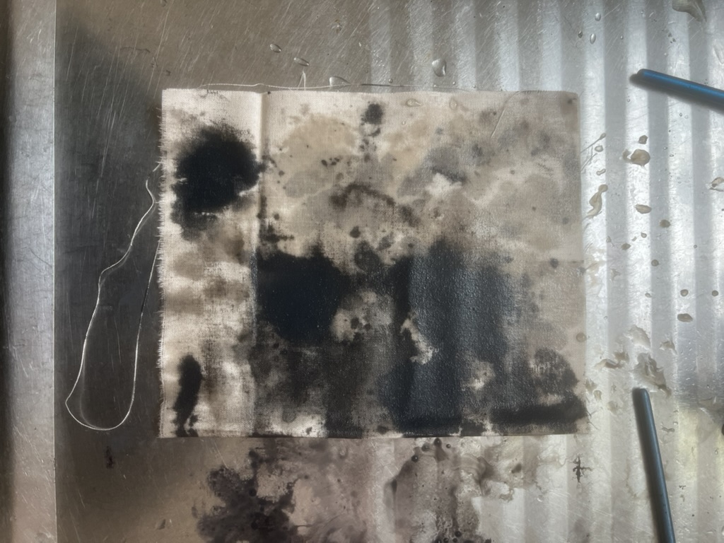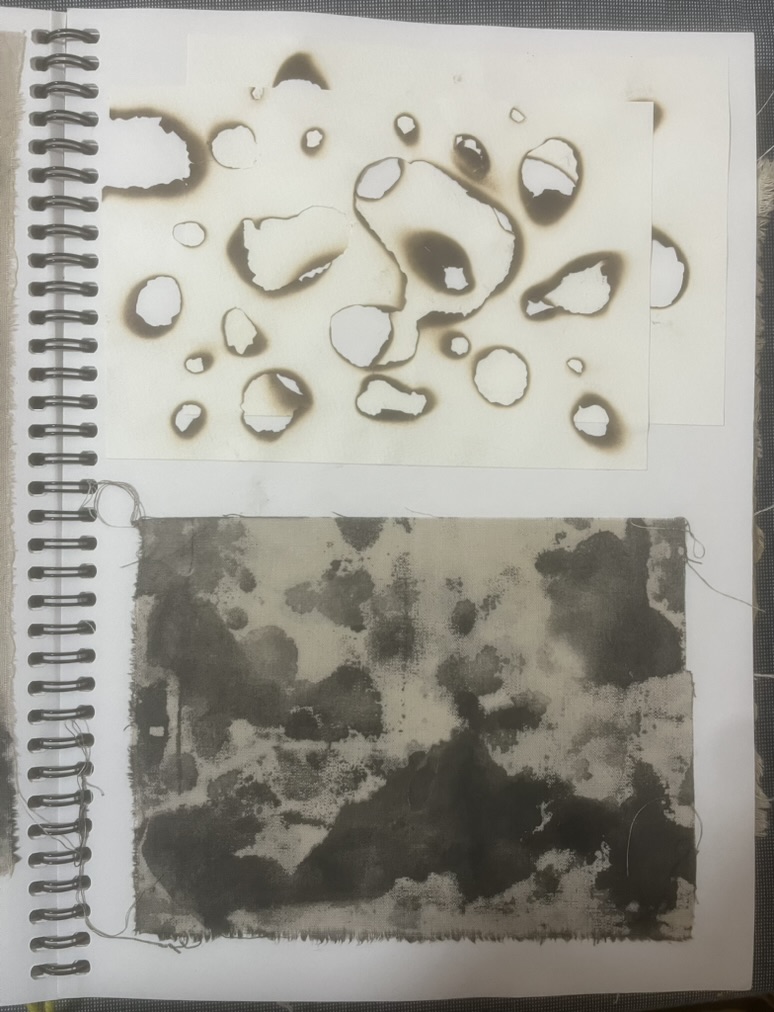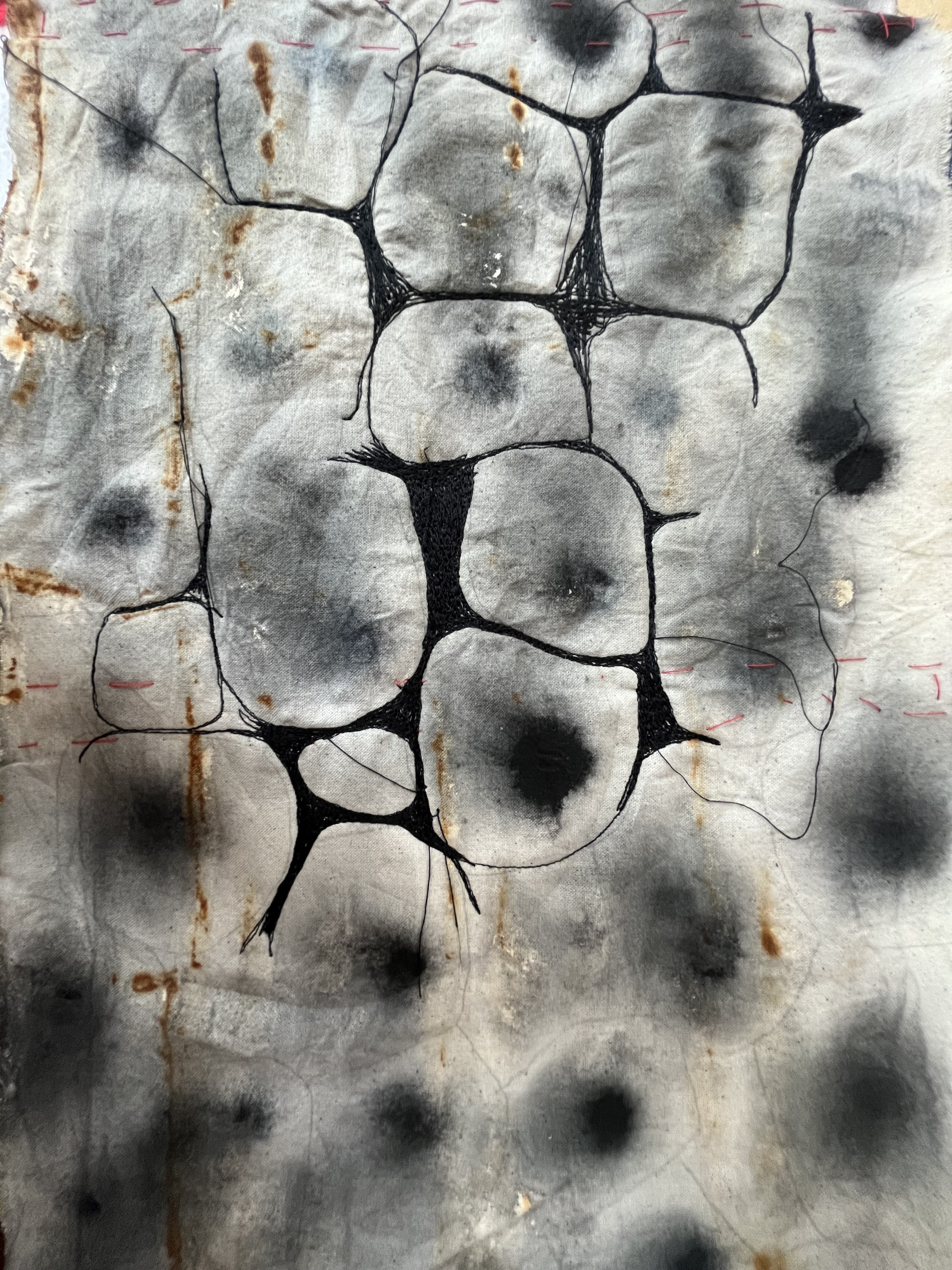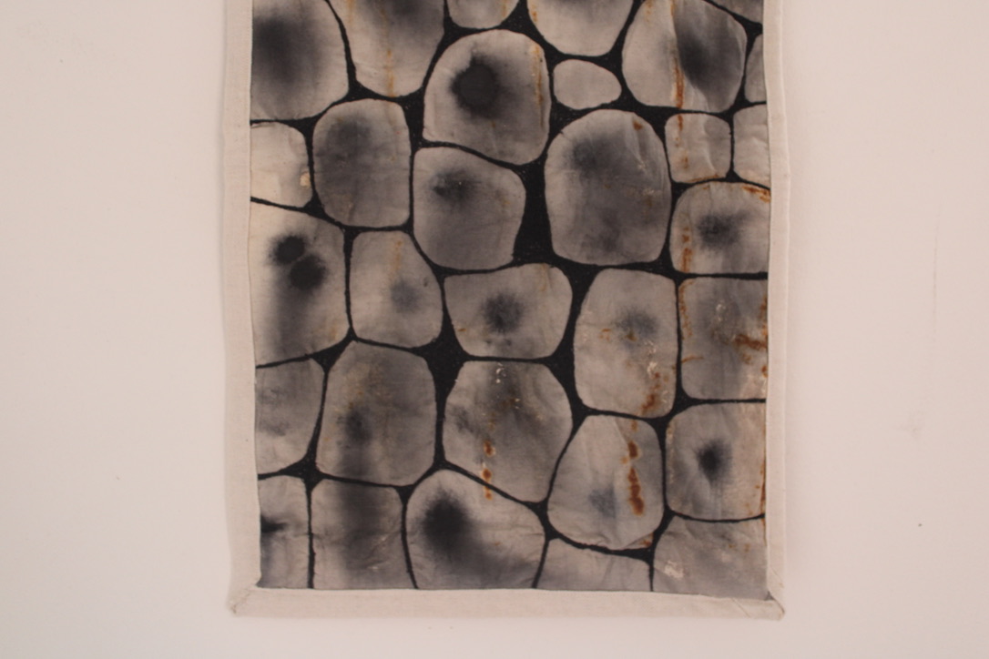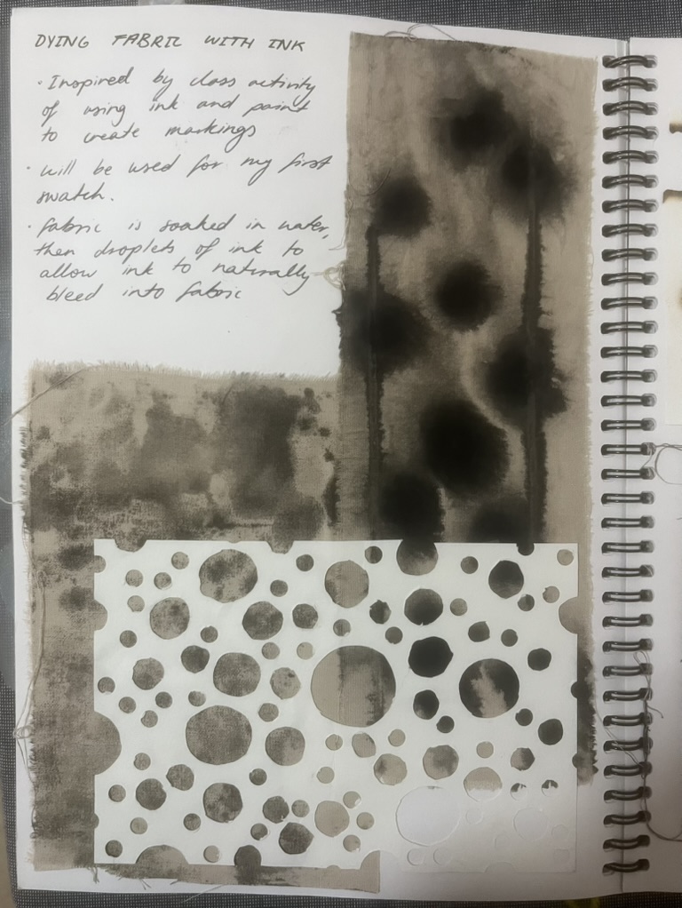 Design Statement: A new life form is born in all its beauty and disgust. The notion of renewal can be identified within the theme of mould through the regeneration of organisms on dying organic matter within soil, and the growth of mould upon natural fibres under specific conditions. Textiles made from natural fibres are hygroscopic, under the right conditions mould thrives upon these fibres, and is a resilient life form therefore difficult to rid of once infection spreads. On the contrary, mould is an important form of renewal as it is essential in the breakdown of organic plant matter within soil. As mould decomposes organic matter beneath the soil, it consumes nutrients which are returned to the soil creating rich compost, and therefore the renewal of organic matter. To explore this, only natural fibres, materials and dyes were used in the process of creating the swatches. The texture and colours of varying types of mould have individually influenced the design process of each swatch created. This piece explores the design practice of textile production, focusing on shapes and how they can be used to create depth and suggest the imagery of mould. The calico base was saturated in water before being painted with black ink to create a moulded design effect. The swatch was then quilted using freehand machine embroidery and felt backing to create texture. This piece continues the cohesive use of natural materials and products throughout the theme of my swatches.