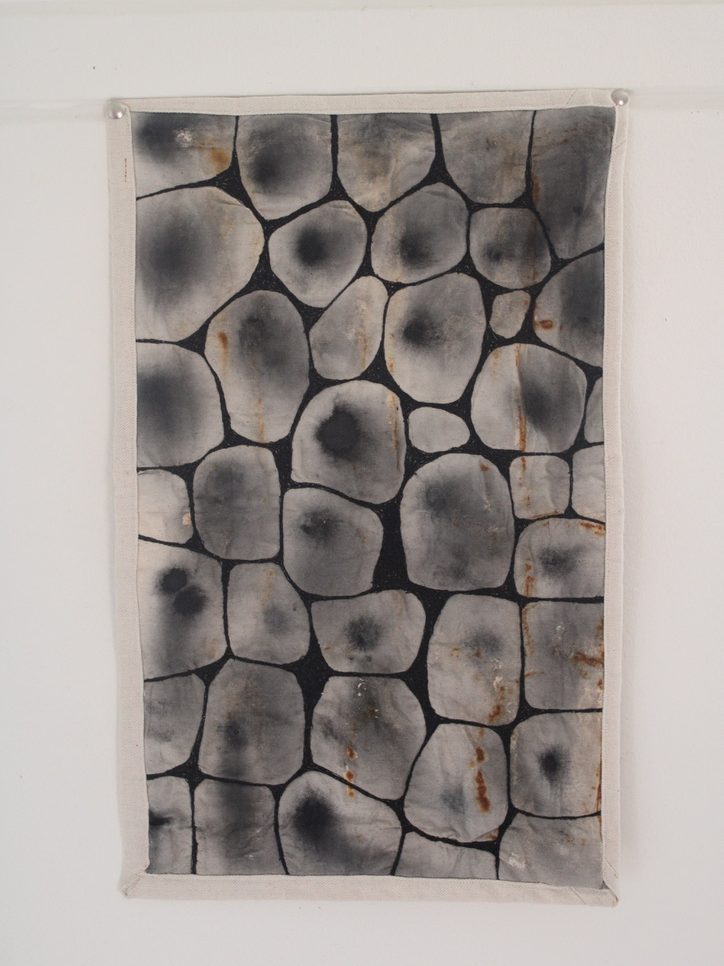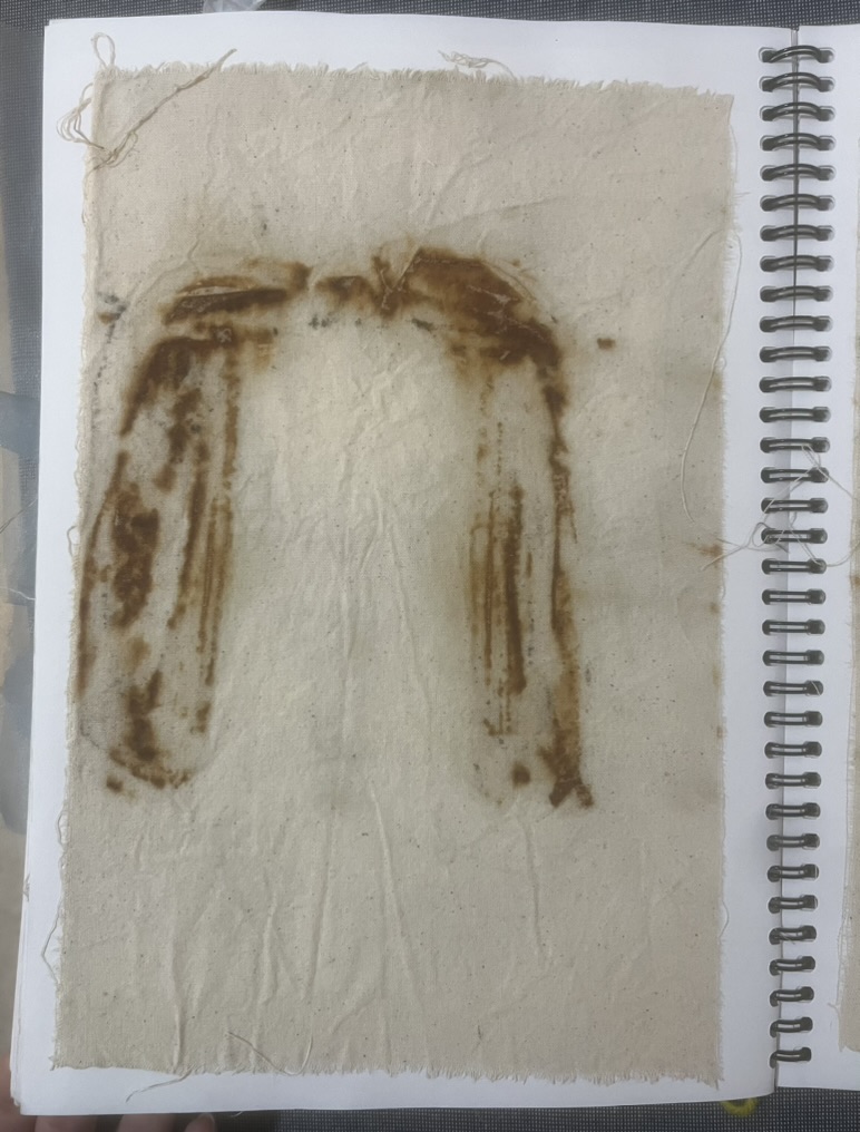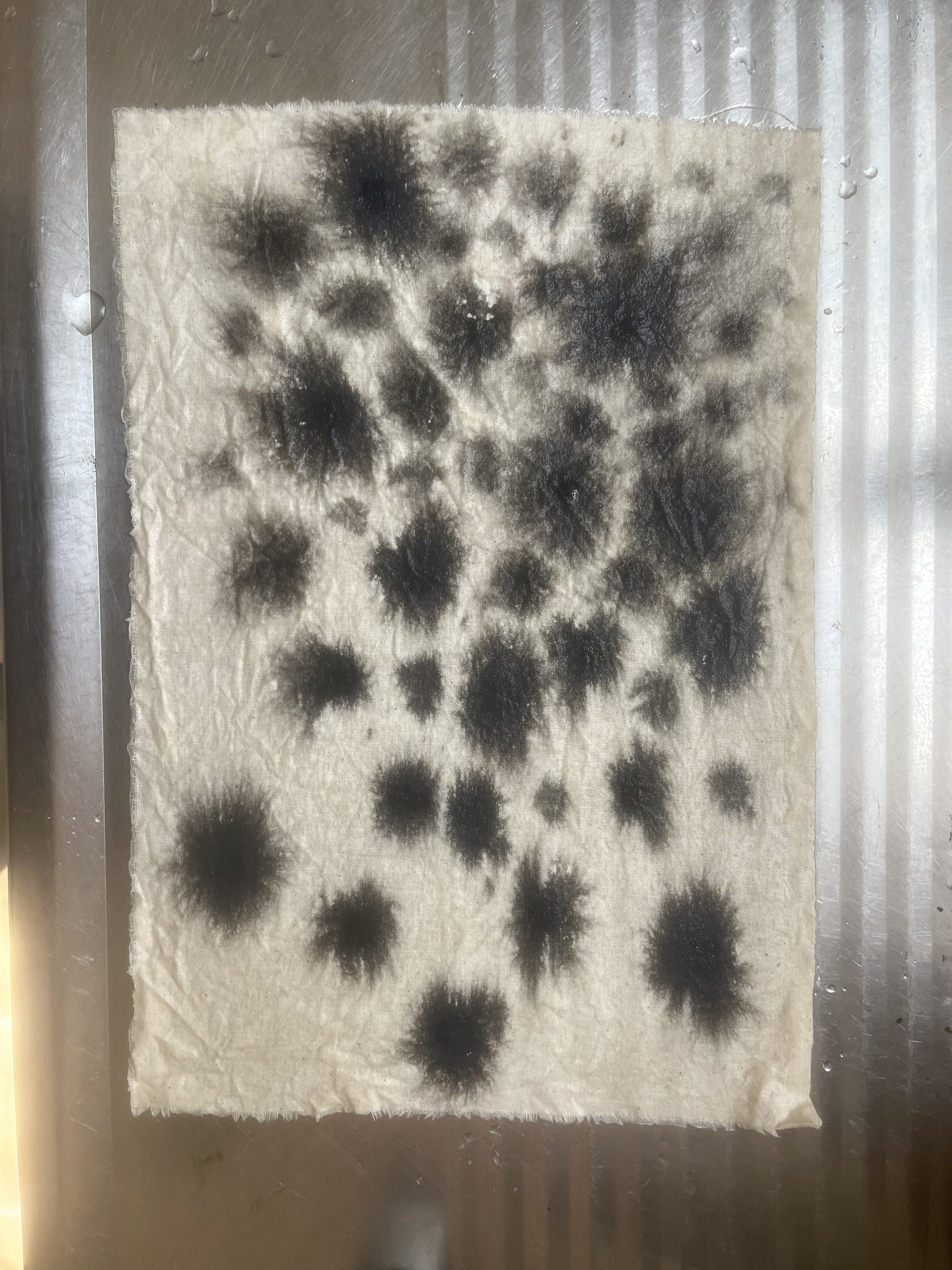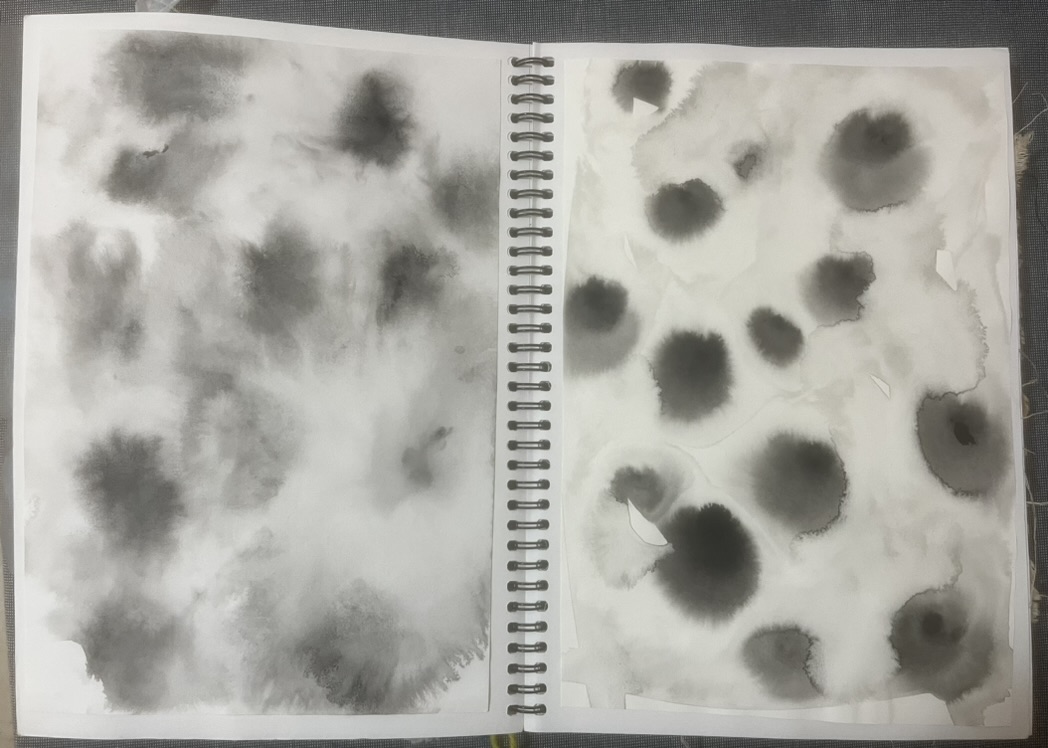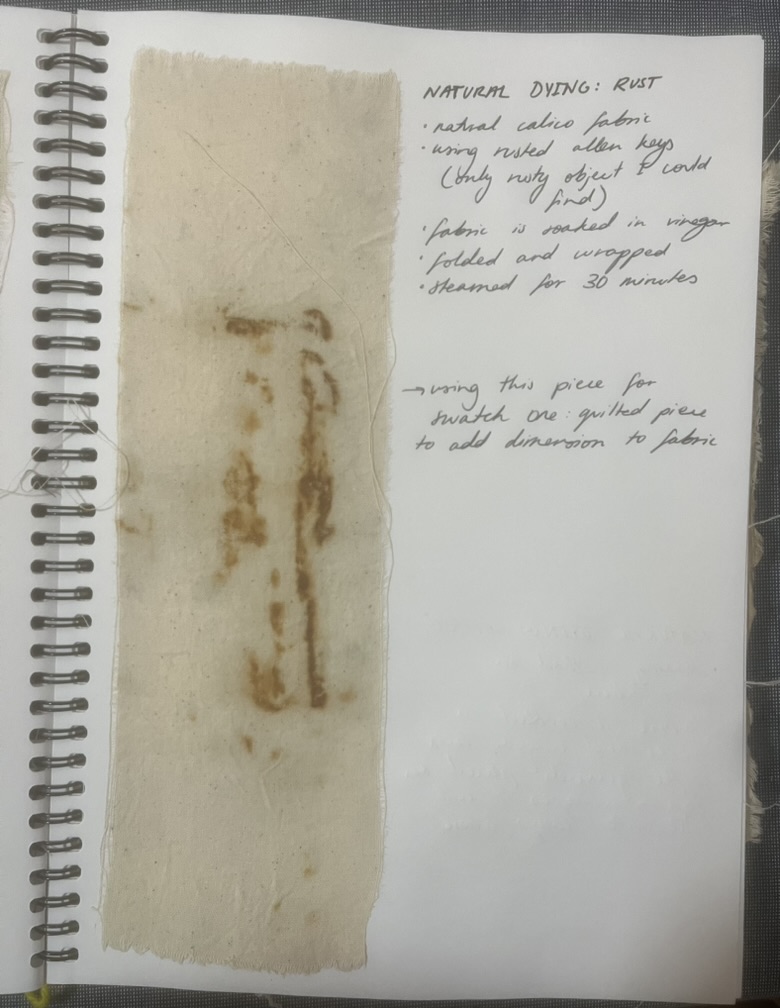 Design Statement: A new life form is born in all its beauty and disgust. The notion of renewal can be identified within the theme of mould through the regeneration of organisms on dying organic matter within soil, and the growth of mould upon natural fibres under specific conditions. Textiles made from natural fibres are hygroscopic, under the right conditions mould thrives upon these fibres, and is a resilient life form therefore difficult to rid of once infection spreads. On the contrary, mould is an important form of renewal as it is essential in the breakdown of organic plant matter within soil. As mould decomposes organic matter beneath the soil, it consumes nutrients which are returned to the soil creating rich compost, and therefore the renewal of organic matter. To explore this, only natural fibres, materials and dyes were used in the process of creating the swatches. The texture and colours of varying types of mould have individually influenced the design process of each swatch created. This piece explores the design practice of textile production, focusing on shapes and how they can be used to create depth and suggest the imagery of mould. The calico base was saturated in water before being painted with black ink to create a moulded design effect. The swatch was then quilted using freehand machine embroidery and felt backing to create texture. This piece continues the cohesive use of natural materials and products throughout the theme of my swatches.